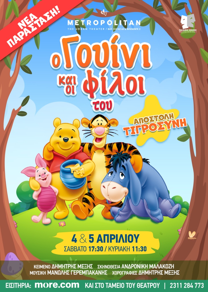 Το αγαπημένο αρκουδάκι των παιδιών και η παρέα του ζωντανεύουν στη σκηνή μέσα από τη νέα παραγωγή της Παιδικής Σκηνής Θεσσαλονίκης, «Ο Γουίνι και οι φίλοι του: Αποστολή Τιγροσύνη!», μια παράσταση γεμάτη χιούμορ, μουσική, φαντασία και μπόλικη…τιγροσύνη, που αναδεικνύει τη σημασία του να πιστεύεις στον εαυτό σου, να σηκώνεσαι κάθε φορά που πέφτεις και να μη χάνεις ποτέ μα ποτέ τη χαρά του παιχνιδιού!